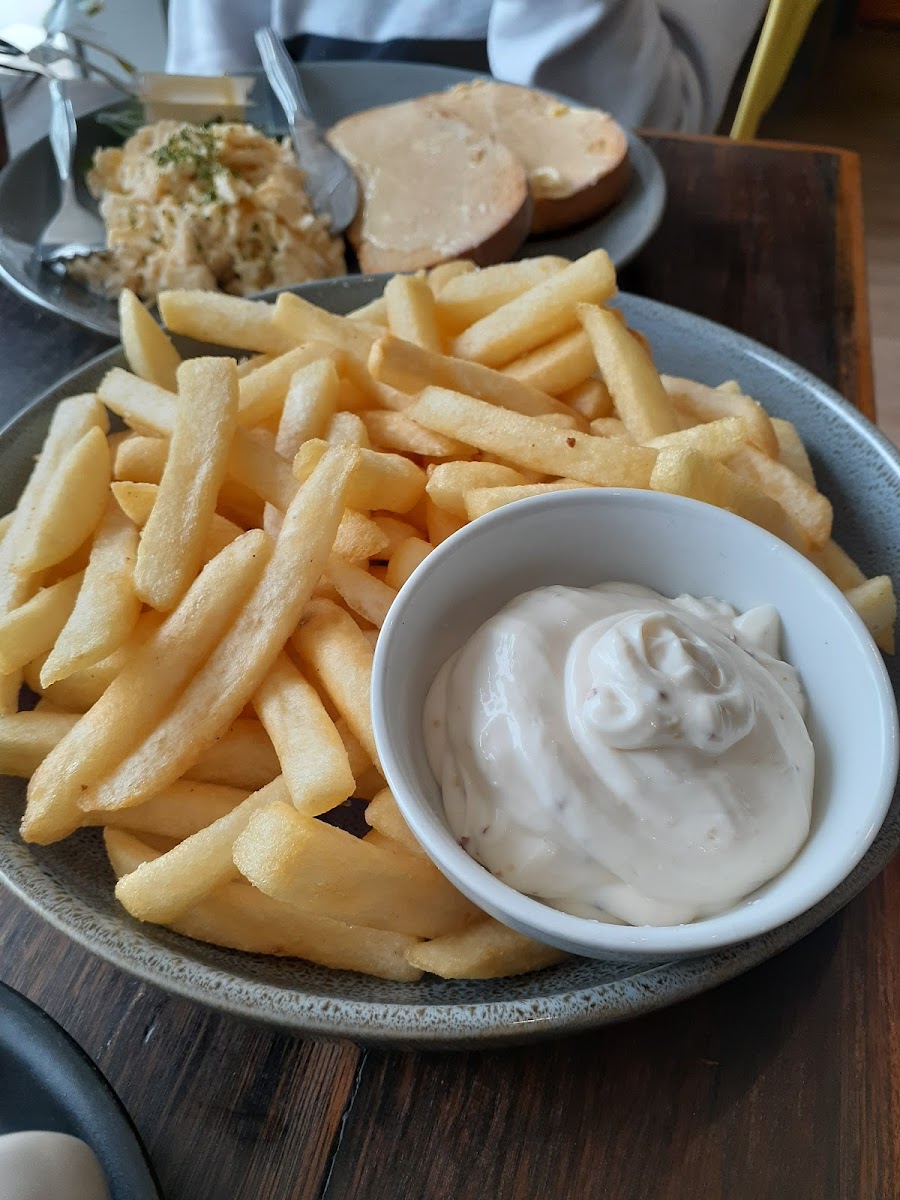 Exceptional customer service, relaxed atmosphere, and amazing coffee! The flat white my wife ordered was perfect, made with the best oat milk and absolutely delicious. Five out of five. The chips could have been a bit crispier, but the generous serving of aioli made up for it. Highly recommend